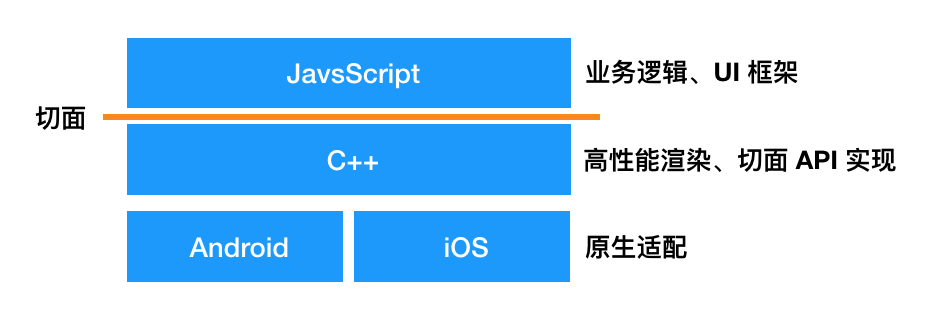 这里的切面是指 JS 层与 Native/C++ 层的分界线,这里会实现一些切面 API,也就是 JS 层与 Native/C++ 层交互的一系列接口,如蓝牙接口、系统信息接口等,由 Native/C++ 层来实现接口,然后往 JS 层暴露,由 JS 层调用。