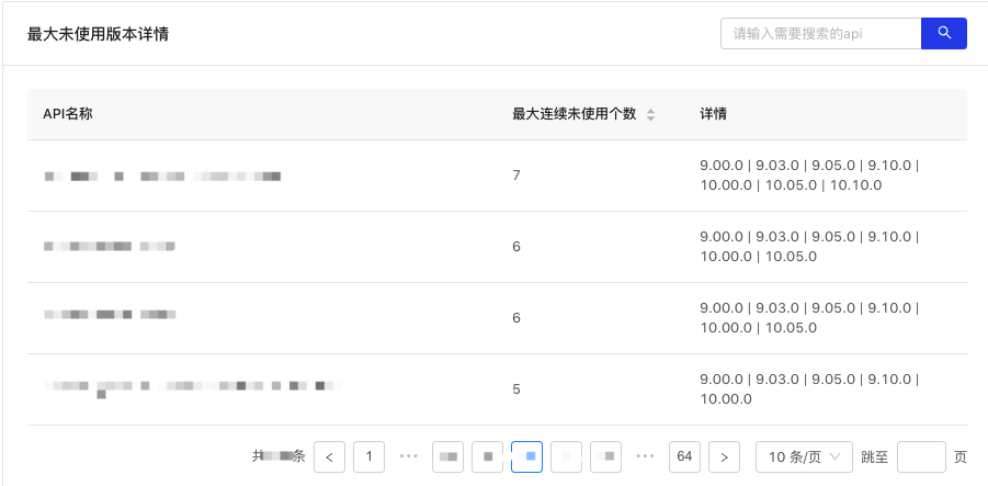 基于逆向依赖数据,结合多个版本的数据,我们还能算出「连续未被引用的版本数」,以衡量下线接口的安全性。
