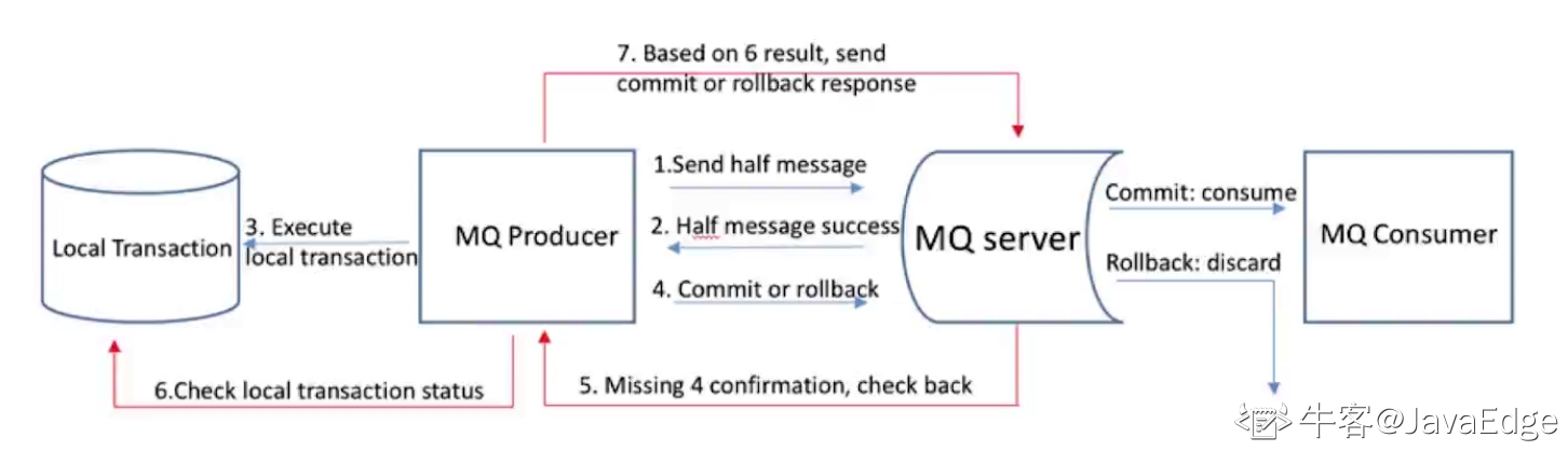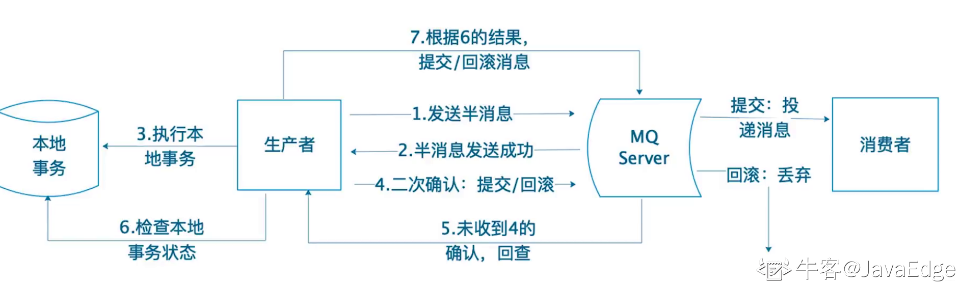 ◆ 半消息( Half(Prepare) Message ) 暂时无法消费的消息。生产者将消息发送到了MQ server ,但这个消息会被标记为"暂不能投递"状态,先存储起来;消费者不会去消费这条消息。 并不是消息的状态,只是一种特殊的消息而已 ◆ 消息回查(Message Status Check ) 网络断开或生产者重启可能导致丢失事务消息的第二次确认。当MQ Server发现消息长时间处于半消息状态时,将向消息生产者发送请求,询问该消息的最终状态(提交或回滚)。