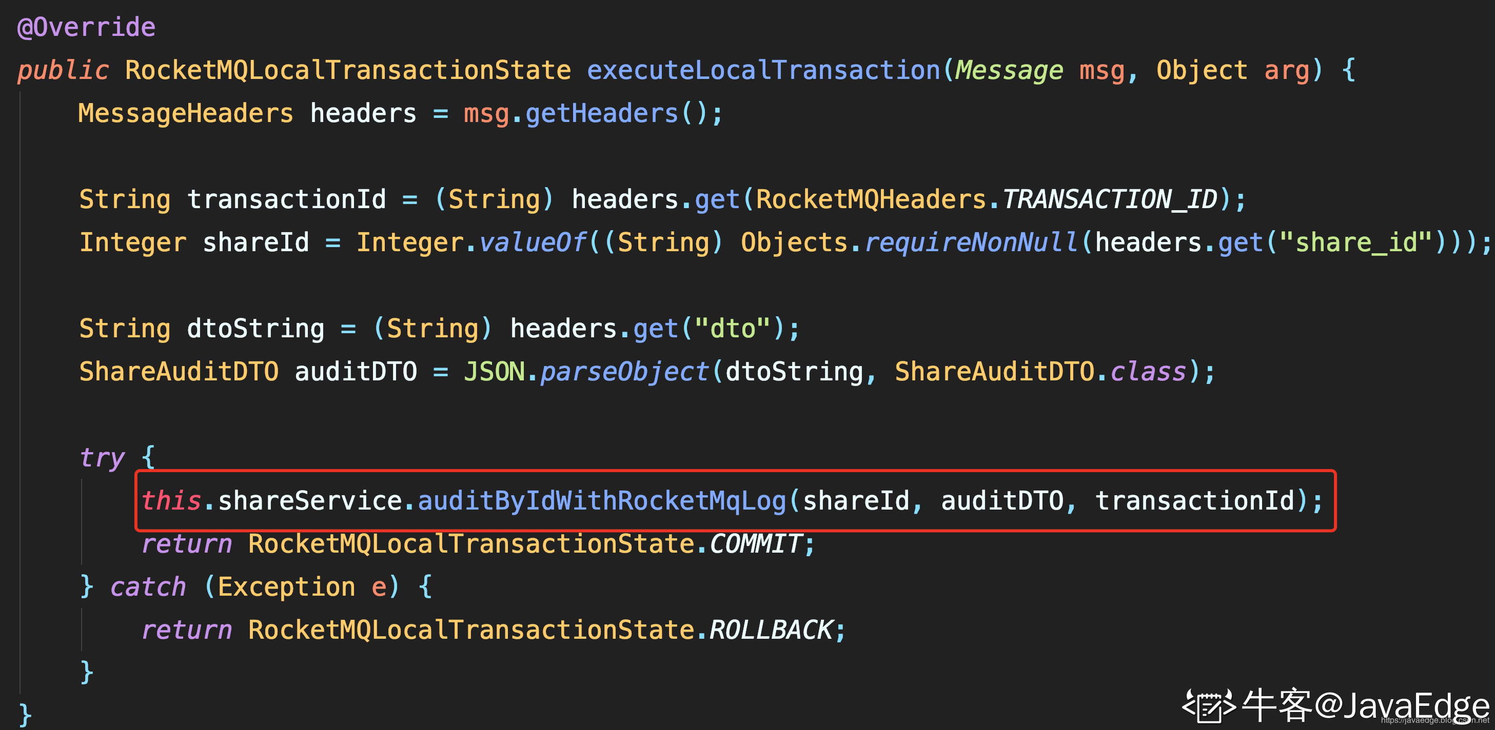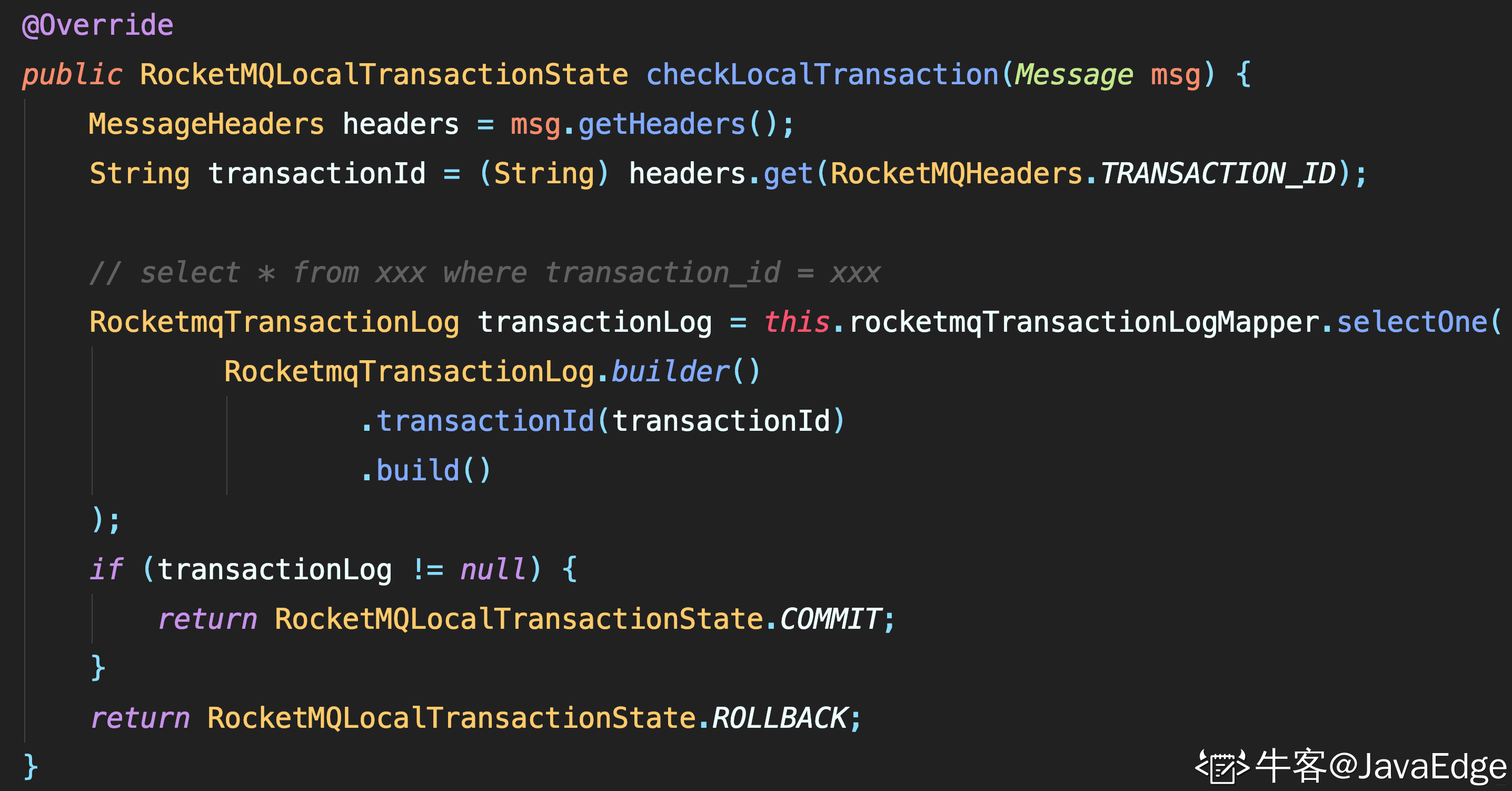 - 回查本地事务执行结果,即通过查询日志记录表,该表在执行完本地事务后更新