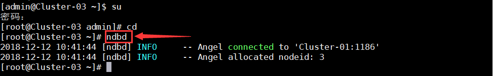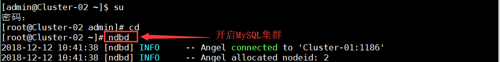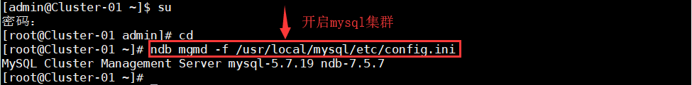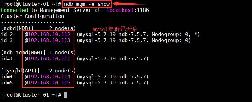 4、用root用户登录,并开启mysql集群,并在管理主机上查看集群是否全部已连接;
