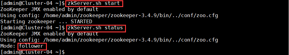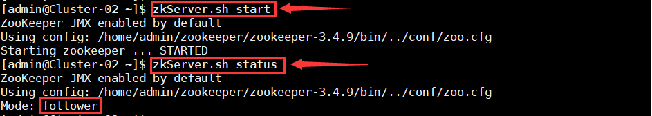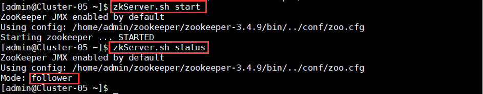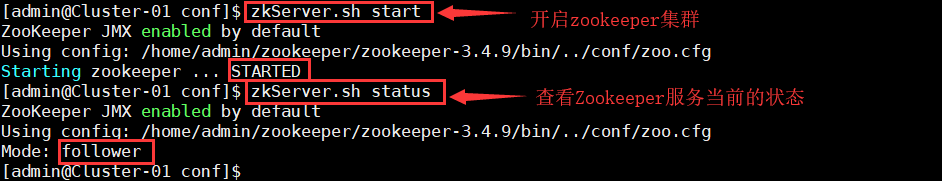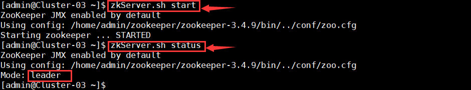 1、集群中所有主机上使用命令“zkServer.sh start”启动Zookeeper服务的脚本,使用命令“zkServer.sh status”查看该节点Zookeeper服务当前的状态,若集群中只有一个“leader”节点,其余的均为“follower”节点,则集群的工作状态正常;