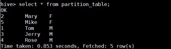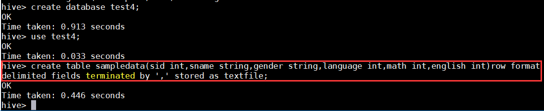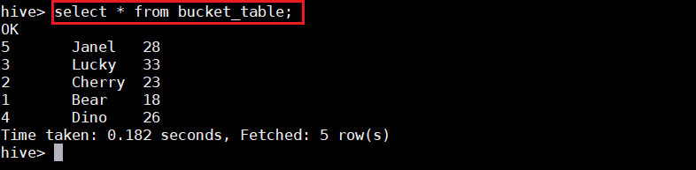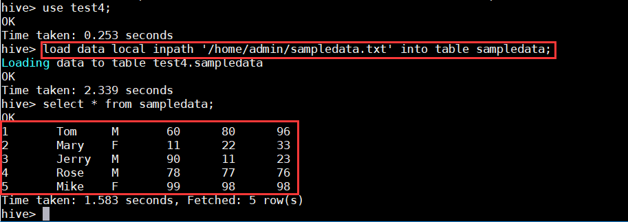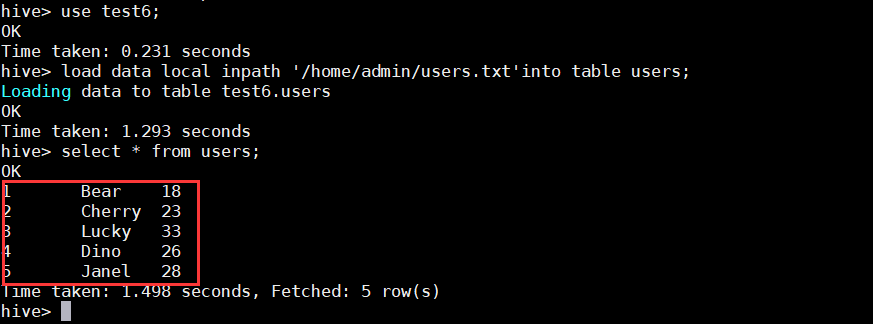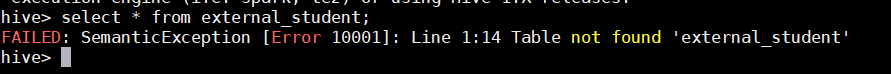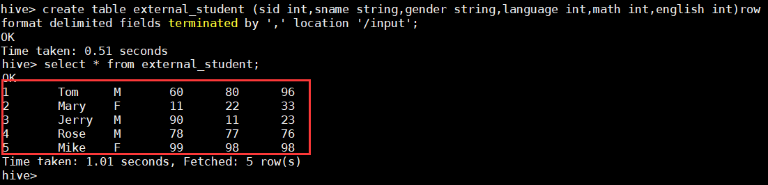 (3)创建数据库test5,并在数据库test5中创建外部表external_student,并查询;