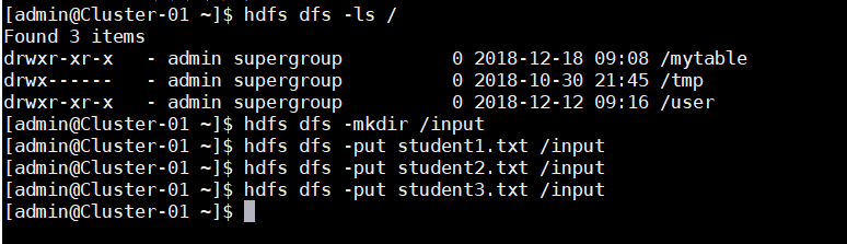 (1)准备数据:在admin家目录下分别新建student1.txt、student2.txt、student3.txt、内容: