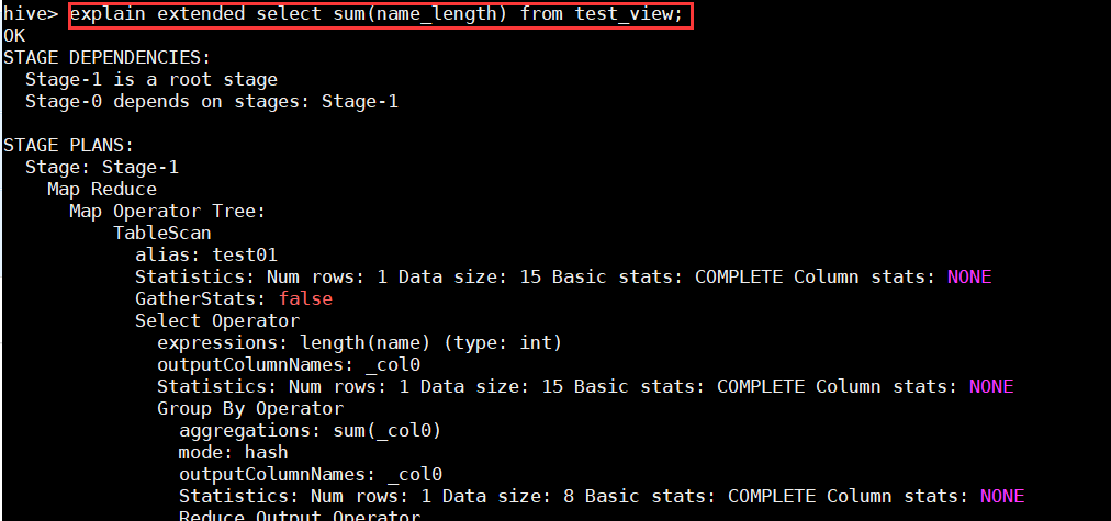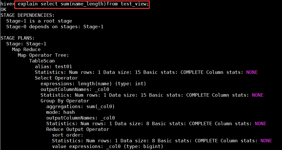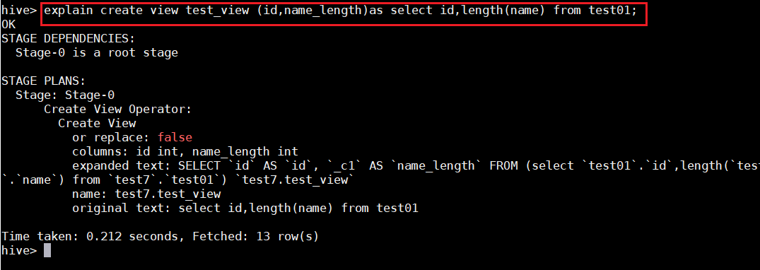 (4)创建一个View之前,使用explain命令查看创建View的命令是如何被Hive解释执行的;