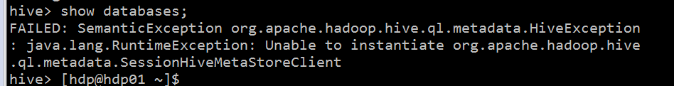 问题二:启动hive正常,进mysql查看hive元数据库myhive也正常,但在hive中执行show databases指令报如下错误: