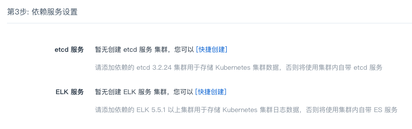 QKE 集群的状态数据默认存储在主节点的 etcd 应用中,同时用户可以选择预先部署 etcd on QingCloud v3.2.24 以上版本,在此处选择其为 QKE 集群的依赖服务,为了便于扩容,推荐添加依赖的 ELK 服务,注意:etcd 集群必须和 QKE 集群在同一 VPC 下。 如果此 VPC 内无可用 etcd 集群,可以在 QKE 创建界面快速创建 etcd 集群。