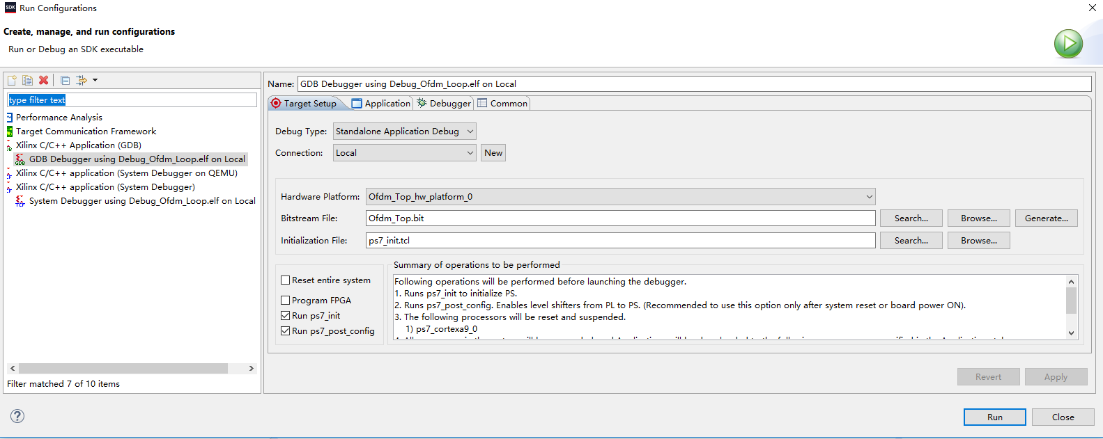 9、 用Chipscope Analyzer配置step6生成的bit文件到芯片,配置界面选择导入step4保存的cdc文件,配置完成后,运行SDK中的run as,随后设置chipscope的触发条件;