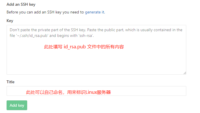 首先建立Linux服务器与git的SSH连接通道,需要将Linux产生的公钥密码,设置到git中。