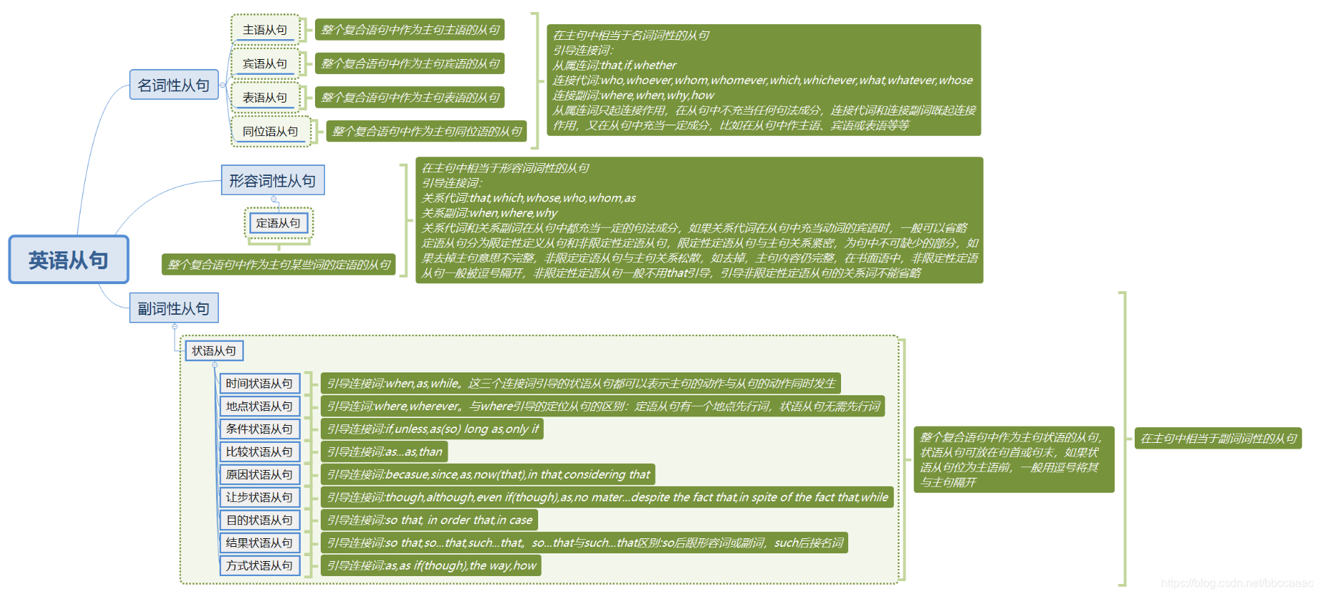 复合句:由主句和从句构成。主句是一个完整的句子,它可以独立存在;从句是一个不完整的句子,它必须和一个主句连用,不能独立存在。从句主要分为三大类:名词性从句(主语从句、宾语从句、表语从句、同位语从句)、形容词性从句(定语从句)、副词性从句(状语从句)