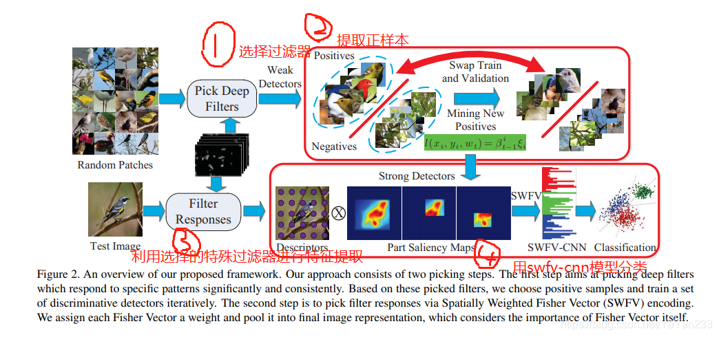 细粒度识别是在大的种类中区分细的种类,比如传统的图像识别只是识别出图像中是猫是狗,细粒度识别是在狗中区别出是那种狗,比如是田园犬,还是萨摩耶,还是秋田狗等等。作者是基于两个步骤寻找深度过滤器,建立了一个框架。第一步是找到对特定模式有显著且一致响应的过滤器,并通过在新的正样本中挖掘和部件模型再培训之间的迭代交替学习一组部件检测器。第二步是通过Fisher向量的空间加权组合来汇集深度过滤响应。