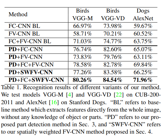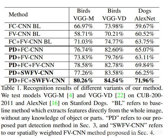 由于最近发展起来的cnn网络需要固定的输入,这样不可避免把背景输入,但事实上背景没啥东西。再就是检测与分类之间有区别由于较大的位姿变化和部分遮挡,检测可能不可靠,并失去关键的识别细节。因此作者提出第二个一种适合于细粒度表示的新特性。作者将CNN的深度滤波响应视为局部描述符,并通过空间加权Fisher向量(SWFV-CNN)对其进行编码。因此提出了一种基于局部显著性映射的条件选择描述符的选择策略,该策略指示了一个像素属于前景部分的可能性。实验表明SWFV-CNN比传统的cnn效果好。