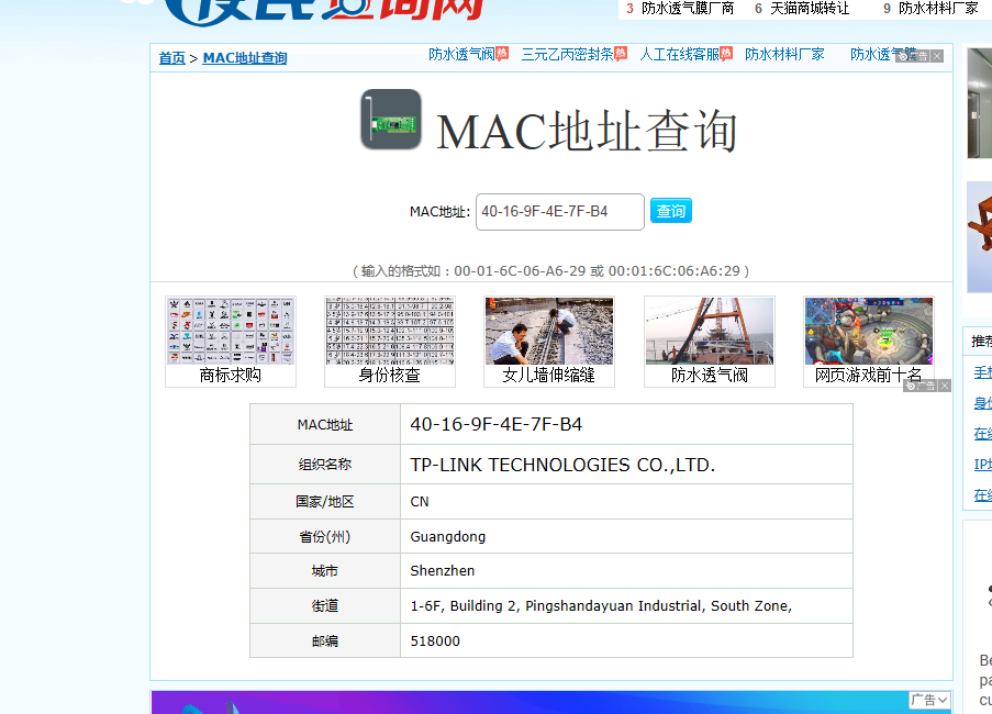 在一个案件中,获取了犯罪嫌疑人的一个MAC地址:40-16-9F-4E-7F-B4,请查询该MAC地址对应的厂商是(附截图)