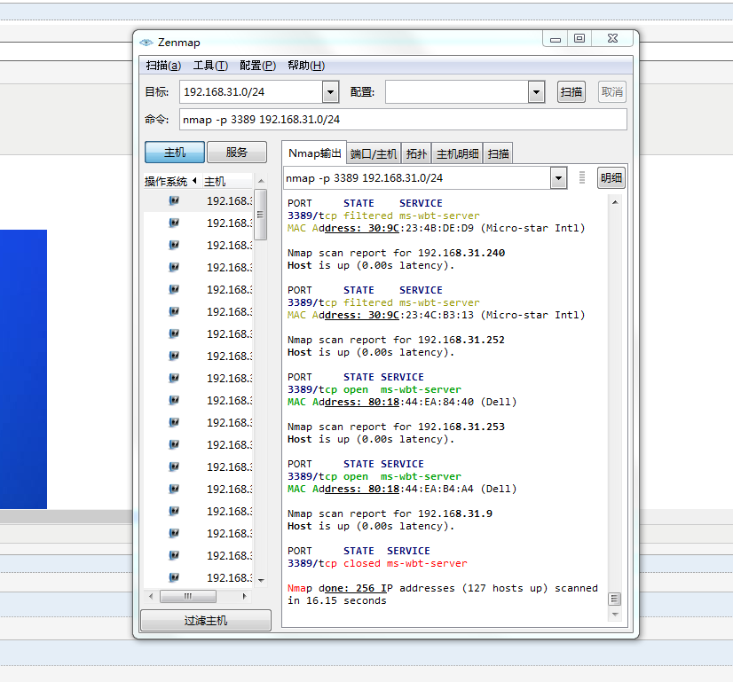 在实验楼上网的局域网内,请扫描出来,哪些机器开启了ftp服务,哪些机器开启了远程桌面连接服务,并附截图证明。