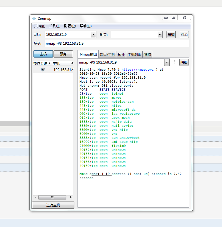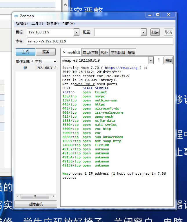 选择一个存活IP地址,扫描所开放的端口(分别用ping扫描,syn扫描尝试),并查询常用端口所对应的服务及操作系统信息。