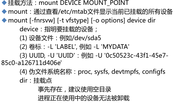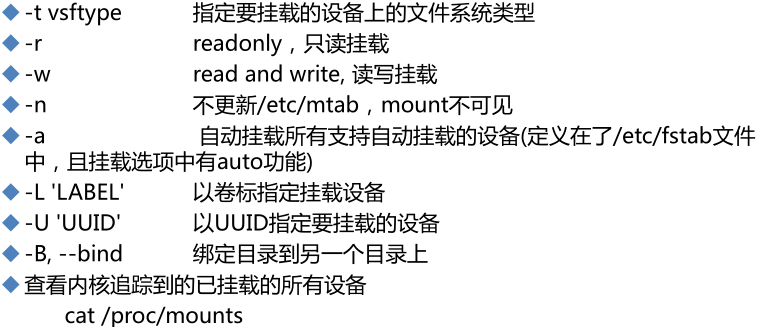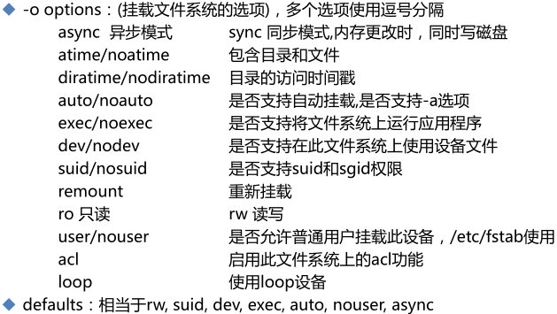 磁盘存储和文件系统(五) 挂载mount 用mount命令挂载文件系统 mount常用命令选项 来源:oschina链接:https://my.oschina.net/u/4270793/blog/3139222 标签 mount