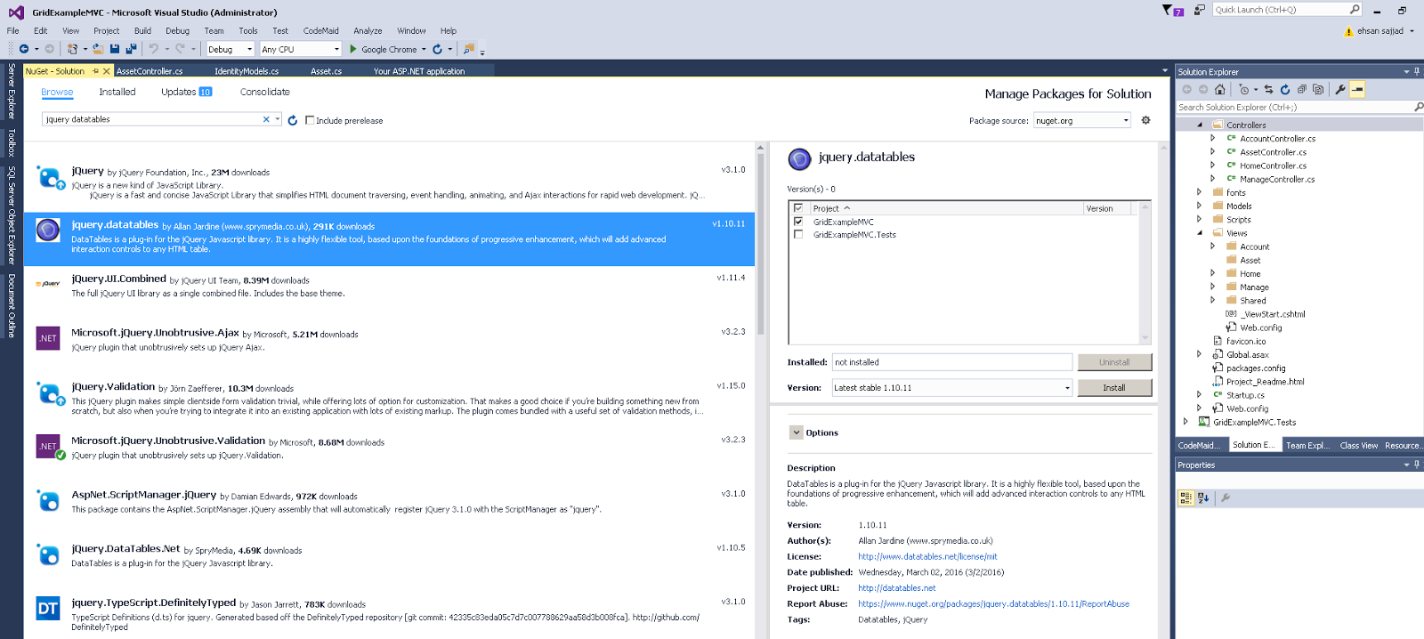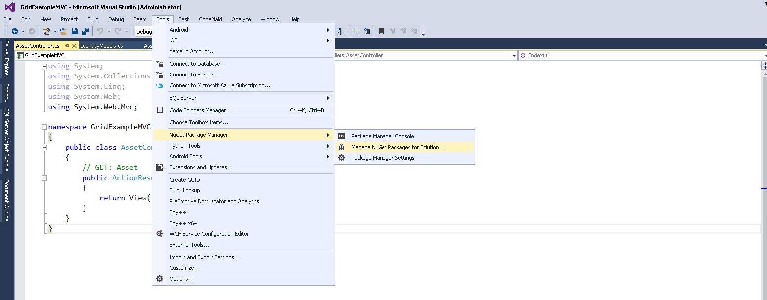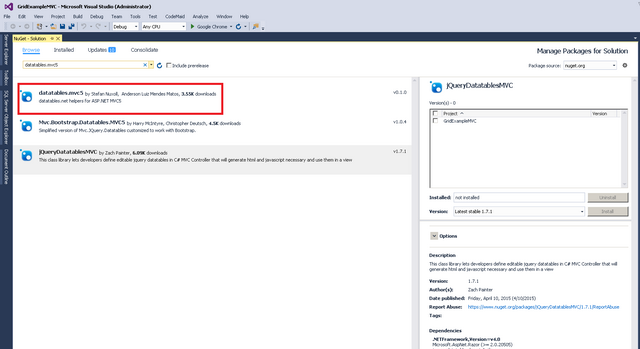 首先,我们需要从 NuGet 包管理器中安装 datatables.mvc5。这是 Stefan Nuxoll 实现的绑定在控制器上的数据集模型。我们为什么需要这个包?这是由于绑定将会提供一个附着在控制器上的强类型的模型,这将有助于我们避免读取请求参数,也会将我们从请求的参数类型转换中解救出来。请求对象中的所有参数传递都不是安全类型的,所以我们必须手动的将它们转换到目的类型,这也将有助于开发人员专注于业务逻辑,而不用总是考虑 HTTP 参数,检查参数、转化参数。