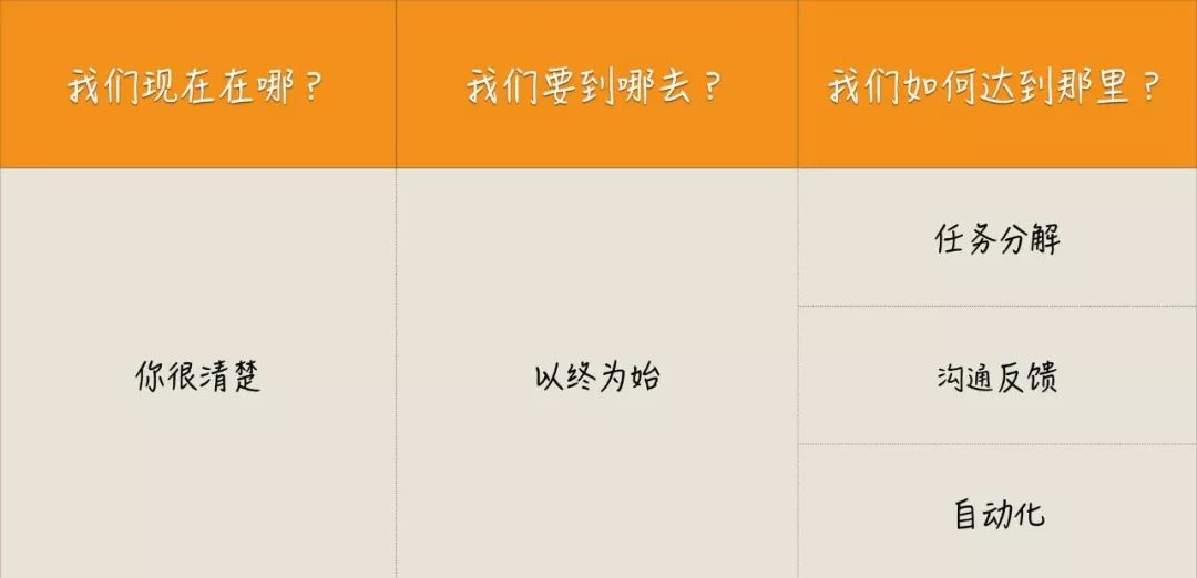 其实,这三个问题来自一个思考框架。在给其他公司团队做咨询时,我也经常会运用到它,原来的问题是: