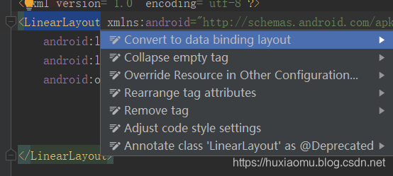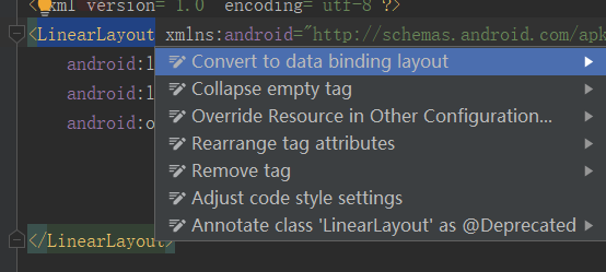 1 选中最外层的布局 ,然后alt +enter 看到提示 转为databinding layout