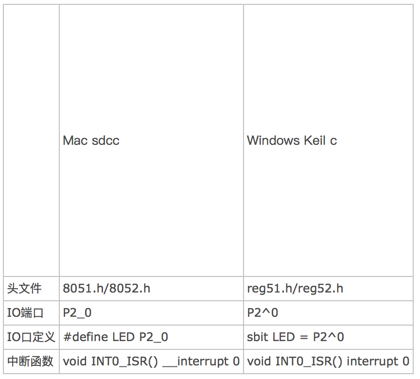 使用sdcc编译单片机程序,跟windows下面keil的c代码是有一些差别的,列表如下:
