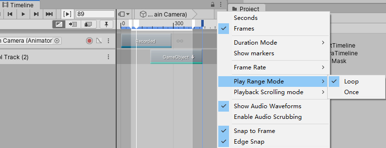在范围播放模式下,可以在Timeline设置中设置播放一次还是循环播放。如下图: