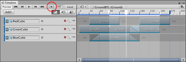 启用范围播放按钮后,可以在指定范围内预览播放。注意只能在Timeline窗口中预览时生效,在运行模式下会忽略范围设置。