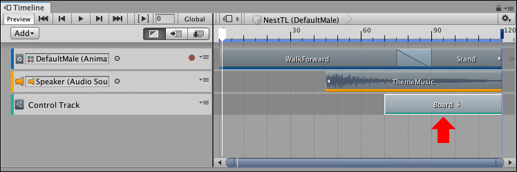 如何创建子Timeline之前已经讲过,稍微复习一下。将一个有Timeline实例的GameObject拖到另外一个Timeline实例的Clip区域中,就可以创建一个子Timeline。如下图所示: