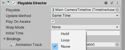 当播放到尽头时,Playable Director组件上面的Wrap Mode属性决定了Timeline会保持最后一帧(Hold)、从头重复播放(Loop)还是什么都不做(None)。
