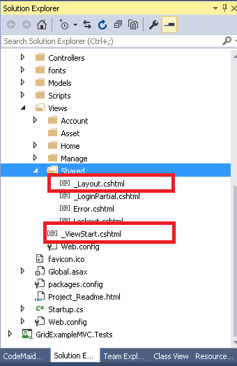 在为数据表添加了脚本和 CSS 之后,我们需要在总体布局中添加它们,默认情况下, _Layout.cshtml 位于 Views >> Shared 中,_ViewStart.cshtml 也默认位于这里。