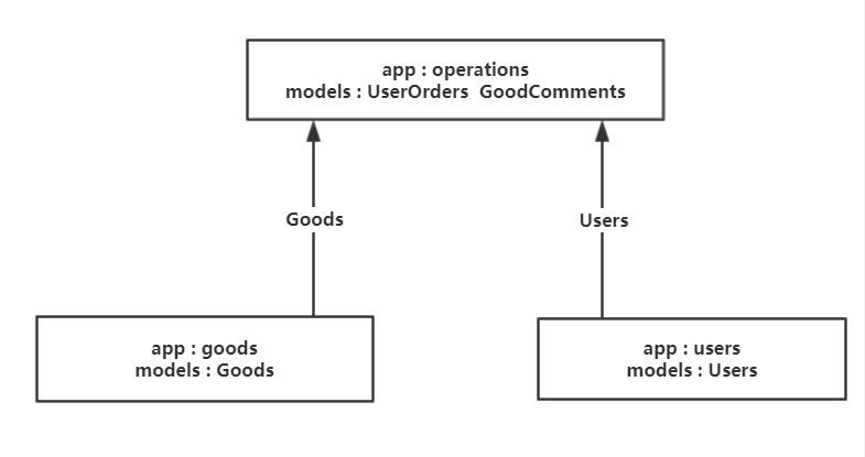 如图所示,我们在原来的两个app中只存放了各自的实体模型类:Goods和Users,因为这两个类肯定会被其他的类引用,而这两个类不会去引用其他的类,所以我们将这两个类所在的app放在了最下层,同时我们又创建了一个app:operations,我们将之前发生相互引用的模型类放在这个app里面,而这个app处于上层,可以去引用下层的模型类来制造关联。这样就避免了循环引用。