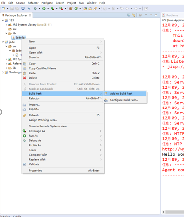 然后把jade.jar文件复制粘贴到 lib 文件夹下,然后选中jade.jar,鼠标右键 Build Path -> Add to Build Path