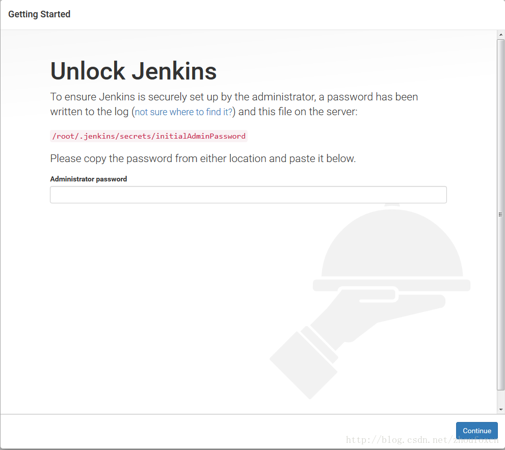 打开/root/.jenkins/secrets/initialAdminPassword将文件中内容复制到文本框中然后继续,如下图所示: