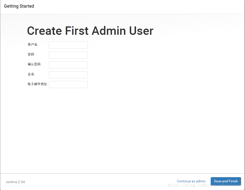 注意:点击“Continue as admin”链接则跳过管理员设置,管理员账户为“admin”,管理员密码为/root/.jenkins/secrets/initialAdminPassword中的内容;点击“Saveand Finish”则保存当前页面填写的内容。