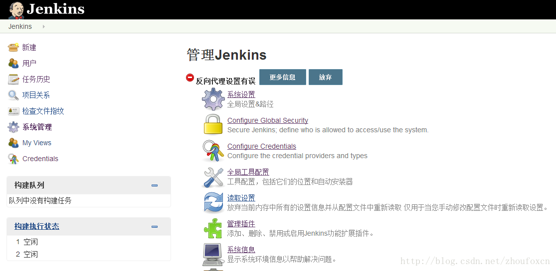 本人的CentOS7虚拟机IP为192.168.60.198,因此在外部可以通过网址http://192.168.60.198/jenkins/访问,以下是访问界面: