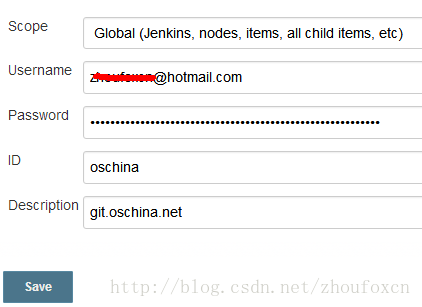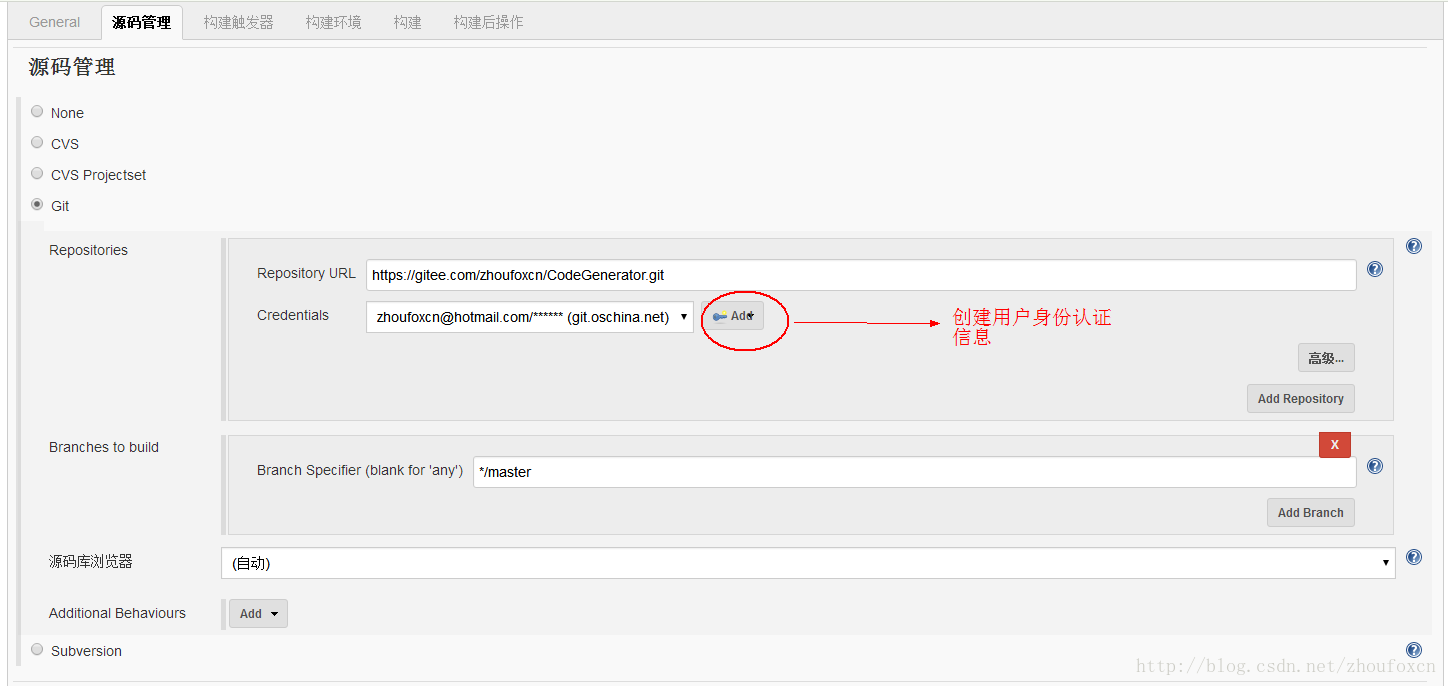 创建C#的持续集成项目和创建Java的持续集成项目没有太大的区别,比如在源代码管理部分除了git版本库URL不一样之外,重用了身份凭据信息,如下图所示: