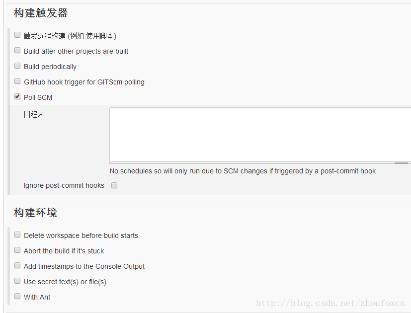 在本项目中构建触发器和构建环境中没有特别设置,如下图所示(在某些项目中可能会要求每次提交代码后就编译项目或者每天定时编译项目,都可以在构建触发器中设置):