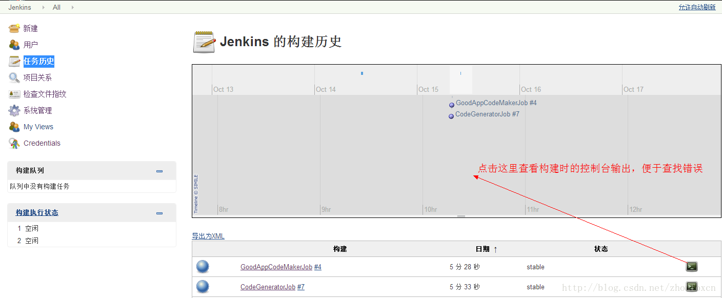 点击Jenkins系统左侧的“任务历史”链接,可以查看历次以来的构建情况,如下图所示:
