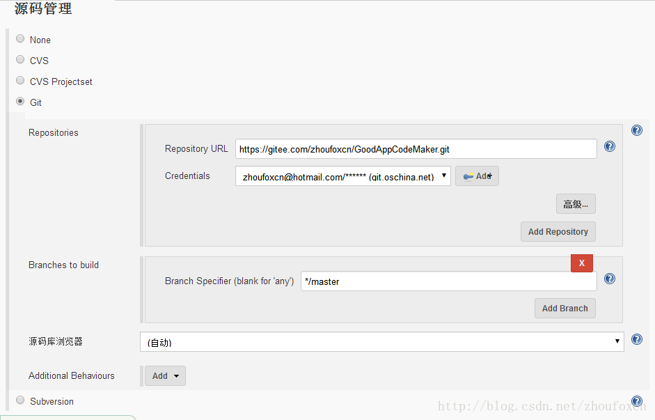 Jenkins支持常见的源代码管控系统,如CVS/SVN/Git等。由于示例项目使用了git作为源代码管控工具,所以需要填写相关的信息,如git版本库地址、认证信息、源代码分支信息。第一次使用的时候因为没有版本库认证信息,需要创建,点击“Credentials”旁边的“Add”按钮,如下图所示: