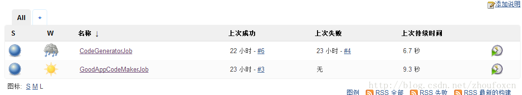 至此,创建了两个持续集成项目,在系统开始页面即可看到刚刚创建的项目,点击最右侧的图标即可立即构建项目。