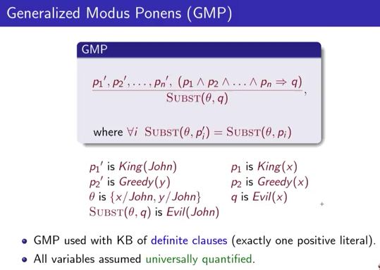 propositionalize虽然可以做到我们想做到的事,但是它有点没效率。怎么样做更有效率点方法呢?我们来首先来介绍一个,我们叫Generalized Modus Ponens