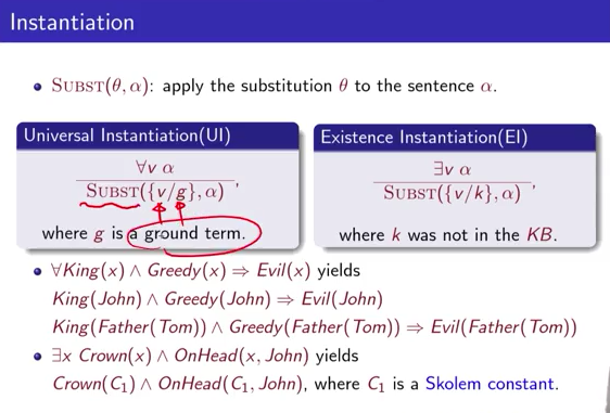 我们假设a是某个句子,前面有全称量词for all。我们就可以用一个常数constant g替换掉全称量词v。因为是针对所有的,那么我们换成任意一个肯定都是可以的。右侧的例子,我们可以做同样的事情,把v替换成k,差别就是K不可以在KB之中。我们待会儿会讲这个是为什么?下面例子,第一个任何贪婪的国王是邪恶的,我们x可以替换成任何的东西,因为他针对的是任意的。第二个例子讲了存在一个人,但是我们不能随便替换,因为人是不同的。所以我们用一个常数C1替换,并且这个C1常数不能是kB中的已知任何东西。之后我们可能会知道C1是小明或者小红,我们可能会演绎出这样的一个结论。skolem constant指的是用过了C1,下次替换存在量词的时候也不可以使用C1这个常量了,即使KB中没有。