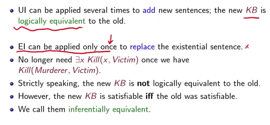 我们刚才有讲过UI基本,你用UI的话,新的KB呢是一个logic equivalent的KB,那如果你EI 换掉的话,它虽然不是logic equivalent,但是在inference上是equivalent的,所以我们称为inferential equivalent。也就是说原来如果某一个sentence被原来的KB entail的话,那就等价于说,它会被新的KB entail。这两件事情是equivalent,所以也就说我们原来first-order logic所要证的东西,我们用现在propositionalized的之后所要证的东西是一样的,那如果原来的KB不能证,那propositionalize之后当然也不能证,但是因为原来就不能证,所以就没有差别。
