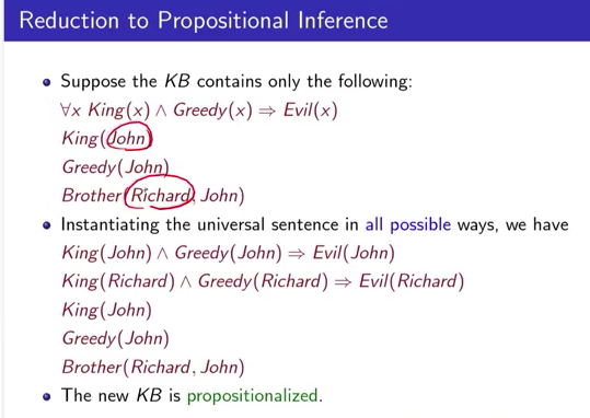 我们假设KB已知,就是我们知道所有贪婪的国王都是evil的,都是邪恶的,那我们知道,这样是国王,这样是greedy,然后我们知道,generalization是brother,OK,好,那首先我们最简单的方法是因为我们现在只知道这里面,就是我们现在的世界只有John跟Richard,好这两个constant,好,那所以我们有一种方法就是把上面这种变数x,用UI把它可能的全部替换掉。那我们现在可能就全部换掉。你就把所有的,这一句话换John,带John换一次,OK,再带入Richard,再换一次。好那剩下的都不用动,所以我们现在得到一个比较比之前大一点的KB,那这KB已经完全就没有quantifier了,也没有唯一的一个那个universal。被我们拿掉了,所以这样可以被我们称为propositionalized命题化。就是原本的first order logic,KB ,我们把它换成了一个propositional logic的KB,一旦换成这KB以后那当然接下来就很简单,就是follow我们上一讲所讲到的inference的方法,你可以用resolution,那如果整个符合horn clause的话,你可以把它利用forward chaining或backward chaining的方式来做。