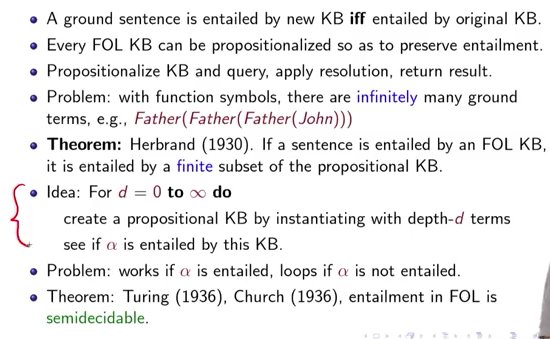 好,那来再讲坏消息。坏消息是就是如果原句是被原来的FOL KB entail,那如果没有呢,就你要证明的东西是原来的FOL的KB是不能证出来的,那这个回圈就会一直重复下去。从0一直到无穷大,过100万,过1000万,还是证不出来就一直展下去,那展到无穷大都证不完。好,那虽然这算是个坏消息,但是其实Turing和Church基本上是证明了,证明出来说FOL的entailment这个problem本身是semidecidable(半决定),如果修过计算理论complexity,serie之类的课程的同学大家知道semidecidable的意思。也就说这个问题如果是个yes no question,如果这个问题是yes的话,我可以在finite有限的时间,跟你回答yes,但是你如果本来答案是no的话我没办法决定它是no,我没办法肯定它是no。这个是semidecidable。也就是说这个我们刚刚讲虽然看似是个坏消息但是实际上呢,任何一个方法都没办法做到。不管你用propositionalize,FOL entailment本身它就semidecidable。所以你不管换任何方法都没办法。这一页意思就是说我们刚刚把一个FOL的knowledgebase去做propositionalize,它中间翻来翻去讲了几次,但是原则上就是说,它有一定的,可以做到一定的地步,就是你如果用这种方法,从0一直往下冲,可以做到一定的地步,也就说如果原来sentence。如果是可以被证出来,你迟早会在有限时间内证出来。那如果你原来sentence是无法被证出来的话,那这个会跑个回圈,但是任何一个方法都一样。