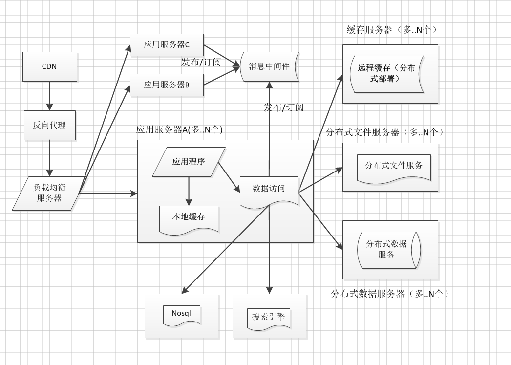 三、发展后期:网站发展后期,我们的技术架构各方面都逐步完善,那到后期我们的技术架构是什么样呢?入下图所示: