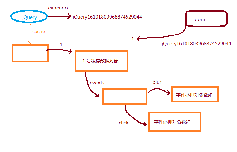 每个元素对应的数据缓存对象上的 events 属性中用来保存这个元素注册的事件处理程序。