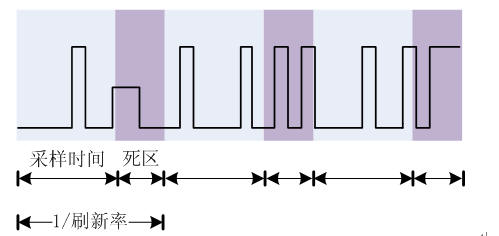 采集一次波形的时间分为两个部分。前面的时间为采样时间,受采样率和存储深度的影响;后面的时间为死区时间,用于处理器计算波形数据、显示、测量等等。两个部分共同决定了刷新率,所以对于长存储示波器必然比短存储示波器的刷新率要低,也说明了为了追求高刷新率,RUN时候的存储深度变低。