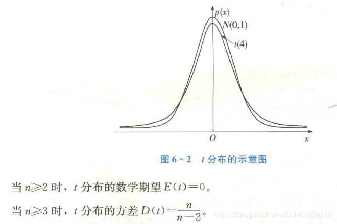 由上图可知,t分布的密度函数曲线与标准正态分布的密度函数曲线非常相似,只是t分布的方差要大一些,尾部要粗一些。一般,当n大于等于30时,t分布于标准正态分布就非常接近。