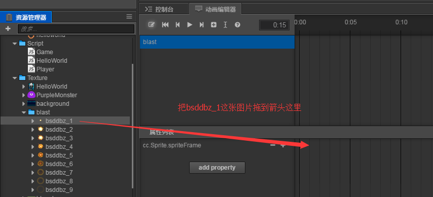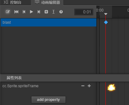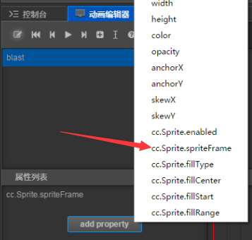 7.点击属性列表中的add property按钮,选择添加cc.Sprite.spriteFrame
