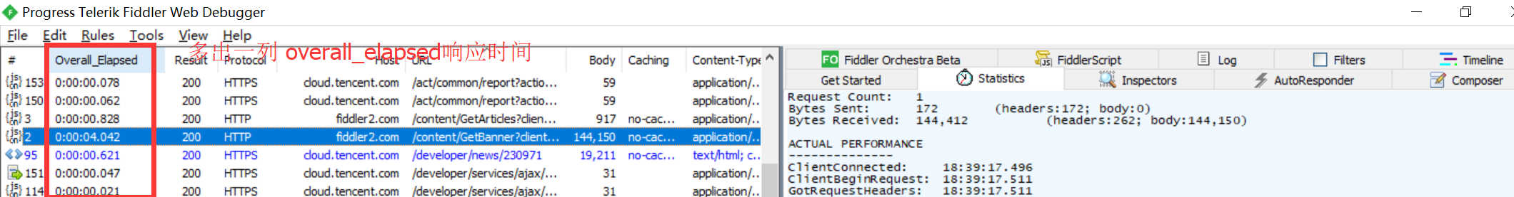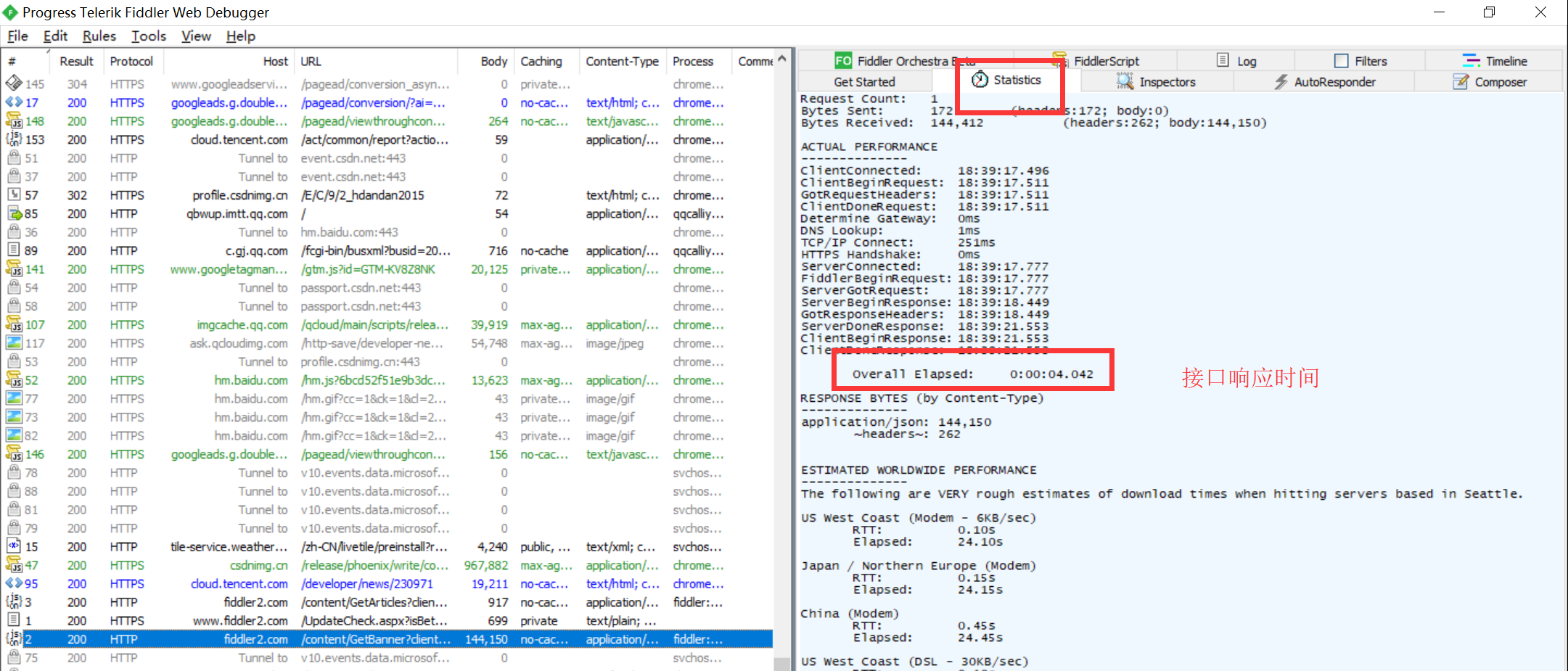 (1)选中单条URL,在右侧的视图中选择statistics->overalll elapsed 的值为接口响应时间